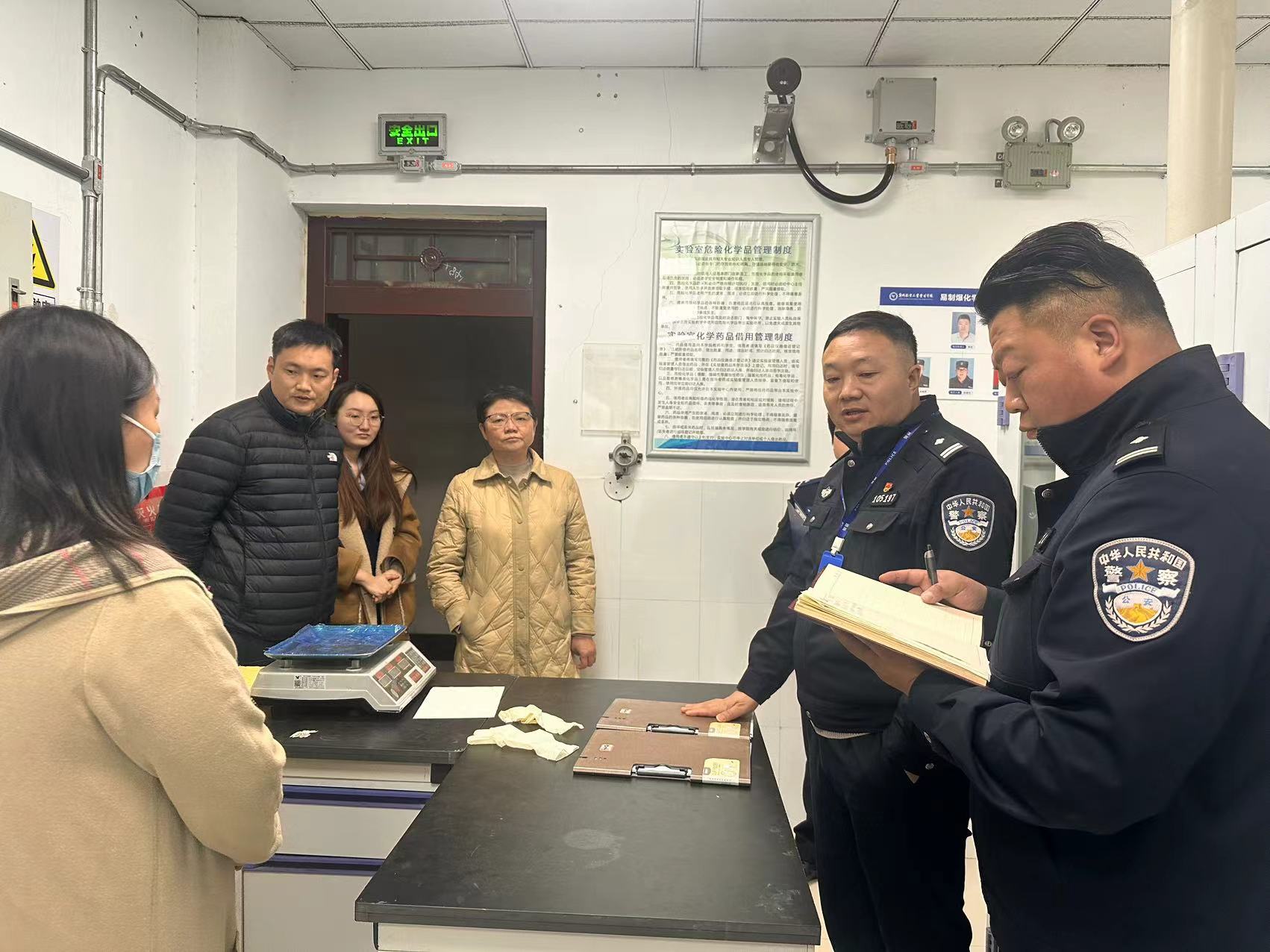 检查组首先实地查看了易制爆化学品的存储环境。实验中心严格按照规范,将相关化学品统一存放于药品库的专用防爆柜中,并配备通风系统、空调及报警装置等安全设施,全面保障存储条件符合安全标准。随后,实验中心管理人员向检查组汇报了易制爆化学品的使用流程和管理制度。公安分局人员对药品台账记录、门禁报警系统、保安巡更及窗外监控等方面提出了具体整改意见,以进一步提升管理规范性。